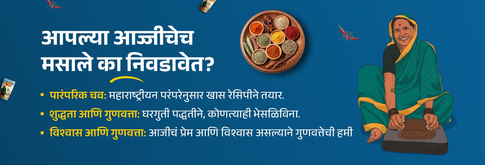 By using same traditional procedure and authentically selected spices we have came up with AAPLI AAJI MASALE PVT LTD.